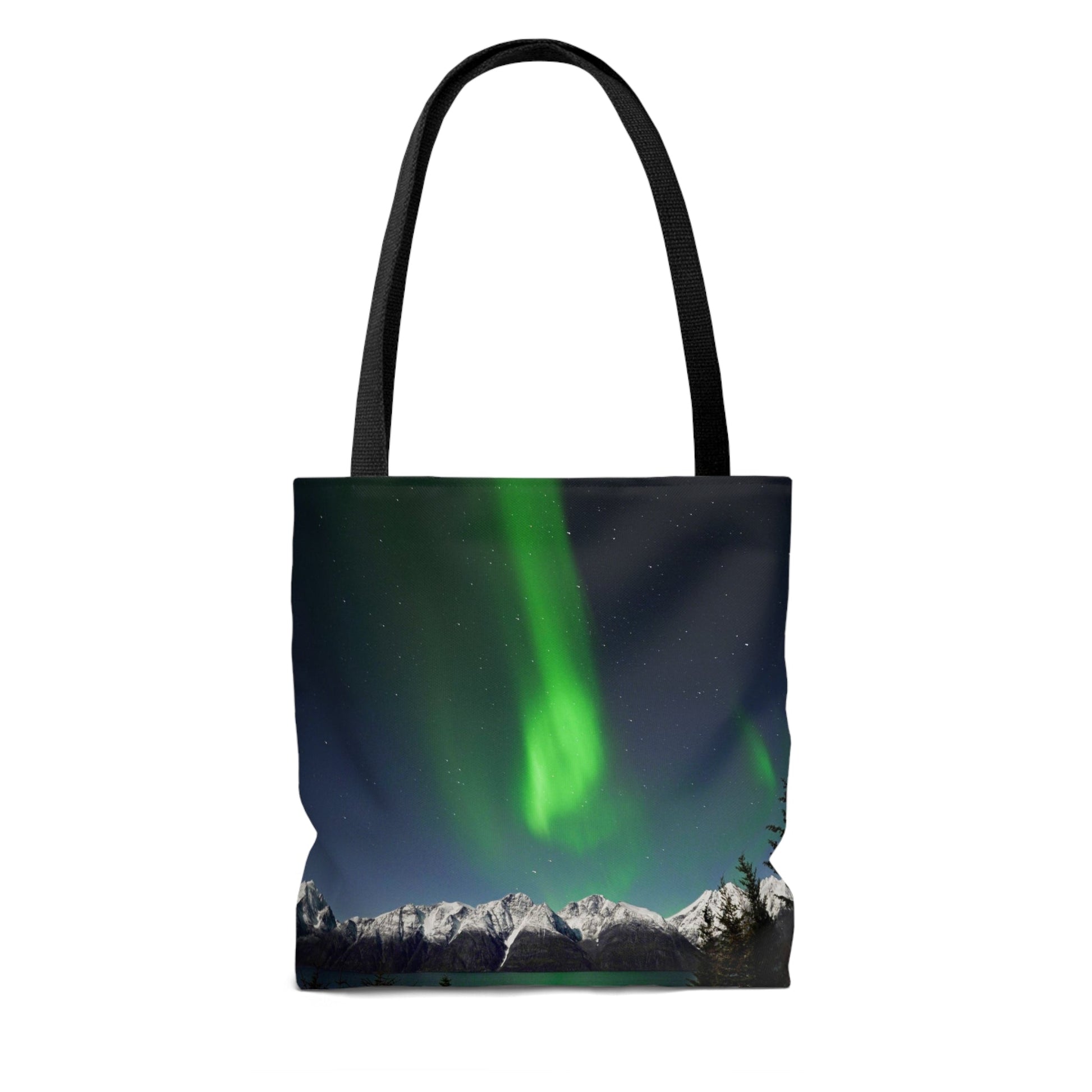 If you like nature the Aurora tote bag is for to buy, Introducing our polyester tote bag adorned with a captivating depiction of the mesmerizing aurora lights. This unique and eye-catching design beautifully captures the essence of the aurora borealis, bringing its ethereal beauty to your everyday style.